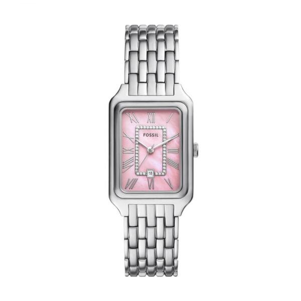 A Fossil Raquel női karóra ES5401 karóra házának anyaga nemesacél, színe ezüst, a szíjának anyaga nemesacél és a színe ezüst. Az óratok átmérője 23 mm, alakja négyszögű. A karóra üvege kristály (nehezen karcolható), szerkezete kvarc és vízállósága 5 atm (50m) (erősen cseppálló).