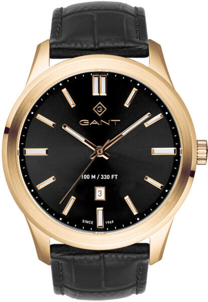 Férfi karóraElemről működikMIYOTA GM12 szerkezetTok átmérője 43,0 mmKör alakú tokAcéltokAranyszínű tokBőrszíjFekete színű szíjMutatós számlapEzüstszínű számlapTizenkét indexszel ellátott számlapÜveg anyaga - ásványi üvegÚszás közbeni vízállóságDátum