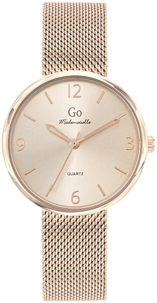 A GO órák világa friss, színes és harmonikus - a francia divatmárka modelljei letisztult eleganciát képviselnek. A tok rozé arany színű IPRG bevonattal ellátott fémötvözet, átmérője 34 mm. Számlapja is rozé színű. A nemesacél fémszíj szélessége 16 mm, mely biztonsági zárral kapcsolódik. Az üvege keményített ásványi üveg, mely ellenáll az enyhe súrlódásoknak, azok nem hagynak rajta nyomot. Japán Miyota 2035 szerkezet garantálja a megbízható pontosságot. Az óra szigetelése cseppálló, mely a kézmosáskor, esőben esetlegesen ráfröccsenő cseppektől véd, de vízbe nem vihető!