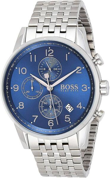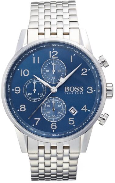 Luxus  Hugo Boss  karórák  a Navigator kollekcióból. Ideális kiegészítők férfiaknak ,   akik előnyben részesítik az analóg és kerek alakú karórákat. A belül ellenálló 11 mm magas tokban, melyet minőségi acél  alkot , megbízható elemes (quartz) gépezetet talál, mely 44 mm átmérőjű számlapot működtet. A számlapot ellenálló ásványi üveg  véd. A tok ezüst, számlap kék és a szíj ezüst színű. Anyagát tekintve acél. A karórák v ízállósága  5 ATM .   Használati utasítás csak angol nyelven van Akár 80% kedvezmény több száz termékre!  Itt van a Fekete Péntek!