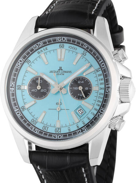 Jégkék színű "sunburst" hatású számlap, kronográf funkcióval és dátum kijelzéssel.