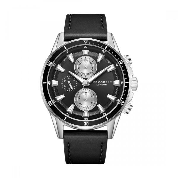 Férfi karóraElemről működikKör alakú tokFém tokEzüst színű tokBőrszíjFekete színű szíjMutatós számlapFekete számlapÜveg anyaga - ásványi üvegVízálló normál viselés esetén