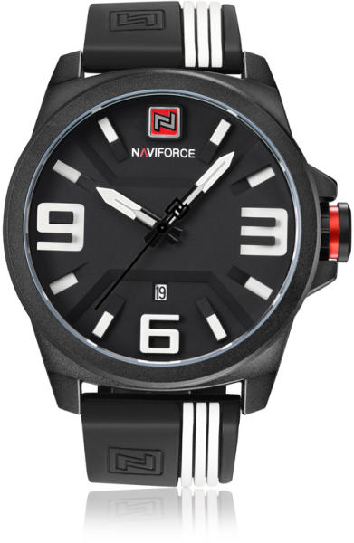 Nagyon vagány, sportos megjelenésű Naviforce karóra fekete és fehér színekben. Az óra fiatalos, vidám és egy kicsit retro benyomást kelt. Az egyik leglátványosabb része a puha gumiszíj, melyen fekete alapon fehér színű csíkok futnak végig. A számlap egyszerű de látványos, 3D-s részletekből áll össze, melyen egy dátum ablak is helyet kapott. A karóra viselése a közepes méretének és a puha gumiszíjnak köszönhetően nagyon kellemes. A mutatók sötétben fluoreszkálnak így az idő leolvasható. Szerkezet: Seiko AL-32