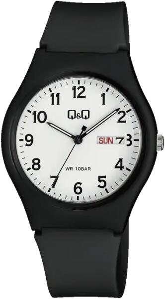 Q&Q analóg férfi sportos karóra, fekete színű műanyag tok, fekete műanyag szíj, arab számos fehér számlap, ásványüveg, quartz szerkezet, cseppmentes vízállóság - A212J003Y (4010-1)