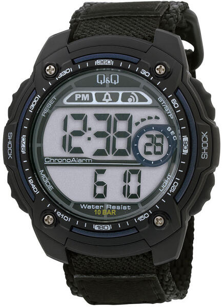 Q&Q férfi karóra, quartz, LCD kijelzés, ezüst színű műanyag tok, fekete színű műanyag szíj, M075J004Y (4095-3)