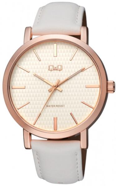 Q&Q analóg férfi karóra, rózsaarany színű fém tok, fehér műbőr szíj, fehér számlap, ásványüveg, quartz szerkezet, cseppmentes vízállóság - Q892J111Y (4026-8)