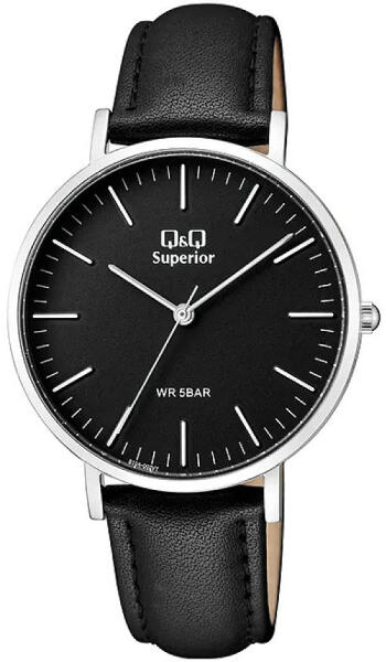 Q&Q férfi karóra, ezüst színű nemesacél tok, fekete bőrszíj, fekete számlap, (Superior), S10A-002VY (4206-9)
