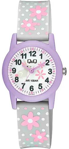 Q&Q gyerek karóra, quartz, lila színű műanyag tok, szürke színű / figurás műanyag szíj, fehér / figurás számlap, V22A-004VY (4074-7)