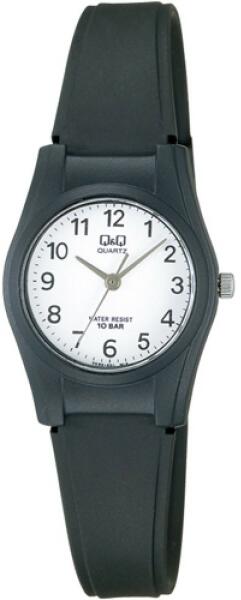 Q&Q analóg női karóra, fekete színű műanyag tok, fekete műanyag szíj, fehér számlap, ásványüveg, quartz szerkezet, 100 m (10 ATM) vízállóság, műanyag hátlap, VQ03J001Y (4240-7)