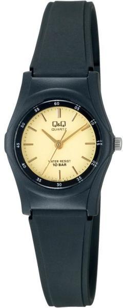 Q&Q női műanyag karóra, quartz, fekete színű tok és szíj, arany színű számlap, VQ05J001Y (4022-9)
