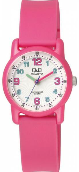 Q&Q analóg gyerek karóra, rózsaszín színű fém tok, rózsaszínű műanyag szíj, fehér számlap, ásványüveg, quartz szerkezet, 100 m (10 ATM) vízállóság - VR41J002Y (4159-7)