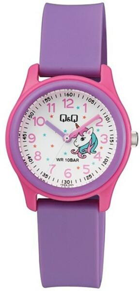 Q&Q gyerek karóra, quartz, ciklámen színű műanyag tok, fehér színű számlap, lila színű műanyag szíj, VS59J003Y (4086-7)