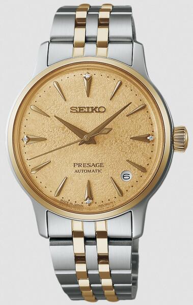 A Seiko Presage Cocktail Time Frozen Daiquiri Diamond bicolor fémszíjas világos okkersárga strukturált számlapos automata női óra 41 órás járástartalékot biztosító 4R35 óraművel(kaliberrel) szerelt, amely az egyik legmegbízhatóbb, legtöbbet használt szerkezet egyik változata. Az óra kapott egy dátum ablakot, egy dátum komplikációt a számlapon 4 és 5 óra között, amelyet diszkréten az aktuális dátumról informál.