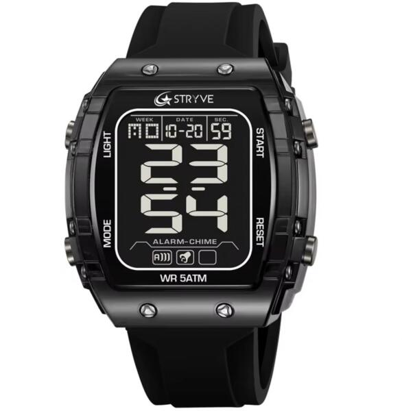 Digitális, egyszerű és stílusos STRYVE Timo karóra a modern dizájn és a mindennapi praktikus funkciók tökéletes kombinációja. Ideális azok számára, akik a minimalista, de egyben robusztus megjelenést preferálják. Tökéletes sportoláshoz és hétköznapi viselethez, számos funkcióval, amelyet minden alkalommal értékelni fog.