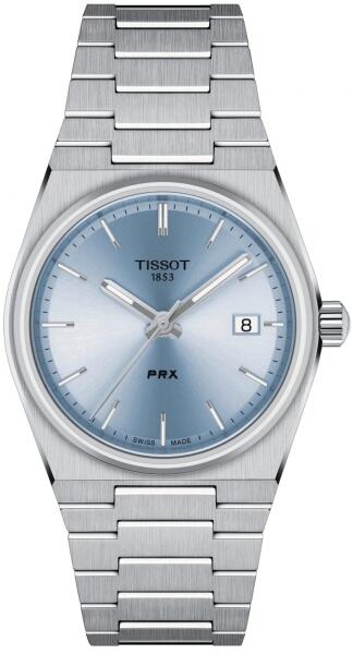 A világos kék Tissot T-Classic PRX karóra unisex tokja 35 mm-es, ami a női csuklón is jól viselhető kategórába sorolja a modellt, a hordó formára hajazó tok és az integrált pillangó csatos szíj egységet alkot és egységes egy pillantásra felismerhető megjelenést ad az órának. A számlap finoman strukturált,   ami különleges hatást biztosit attól függően hogyan esik rá a fény, az indexek és a mutatót foszforeszkáló bevonattal készülnek, 3 óránál egy keretes dátumablak figyel.
