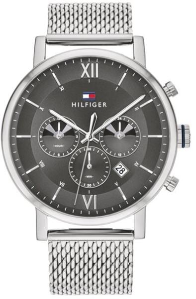 Divat  Tommy Hilfiger  karórák  a Evan kollekcióból. Ideális kiegészítők férfiaknak ,   akik előnyben részesítik az analóg és kerek alakú karórákat. A belül ellenálló 11 mm magas tokban, melyet minőségi acél  alkot , megbízható elemes (quartz) gépezetet talál, mely 44 mm átmérőjű számlapot működtet. A számlapot ellenálló ásványi üveg  véd. A tok szürke, számlap szürke és a szíj ezüst színű. Anyagát tekintve acél. A karórák v ízállósága  5 ATM .   Használati utasítás csak angol nyelven van