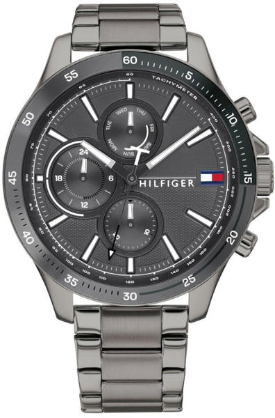 Divat Tommy Hilfiger karórák a Bank kollekcióból. Ideális kiegészítők férfiaknak,  akik előnyben részesítik az analóg és kerek alakú karórákat. A belül ellenálló 11 mm magas tokban, melyet minőségi acél alkot, megbízható elemes (quartz) gépezetet talál, mely 46 mm átmérőjű számlapot működtet. A számlapot ellenálló ásványi üveg véd. A tok szürke, számlap szürke és a szíj szürke színű. Anyagát tekintve acél. A karórák vízállósága 5 ATM.  Használati utasítás csak angol nyelven van