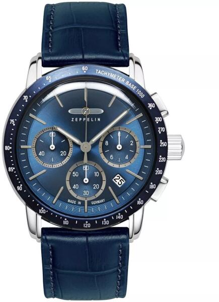Zeppelin New York Chronograph férfi karóra típusa 8878-3. Zeppelin New York Chronograph férfi karóra 8878-3 quartz szerkezettel 2 év magyarországi garanciával. . Az óra ezüst színű kör alakú rozsdamentes orvosi acél óratokkal, kék színű számlappal, és edzett ásványüveggel rendelkezik. Az óra vízállósága 3 ATM(fröccsenő víz ellen védett), átmérője 42mm, vastagsága 16mm. Szíja kék színű bőr.
