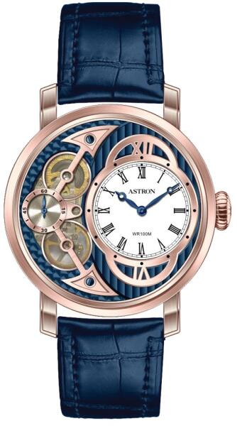 ASTRON 5522-4 férfi karóra, rózsaarany színű nemesacél tok, kék bőrszíj, kék számlap, keményített ásványüveg, (mechanikus+quartz) szerkezet, 100 m (10 ATM) vízállóság (5522-4) - oranagykereskedes