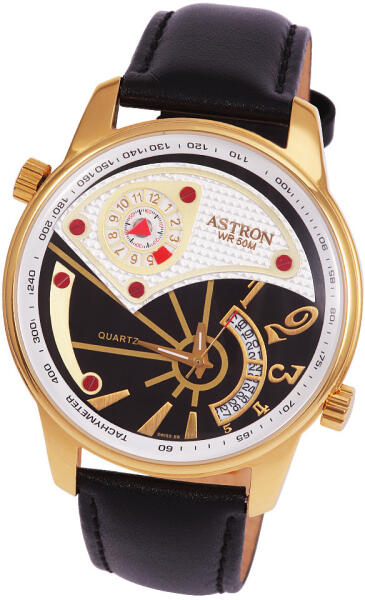 ASTRON 5604-0 férfi karóra, arany színű nemesacél tok, fekete bőrszíj, extravagáns számlap, keményített ásványüveg, multifunkciós quartz szerkezet, 50 m (5 ATM) vízállóság (5604-0) - oranagykereskedes