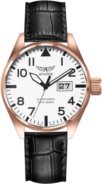 Márka: AVIATOR | Kollekció: AIRACOBRA P42 | Modell: V. 1.22. 2.152. 4 | Garancia: 2 évek | Szín: fekete | Tok színe: rózsaarany | Tok anyaga: nemesacél | Táplálás: elem | Szíj anyaga: bőr | Funkciók: Dátum – a hónap napja | Funkciók: Super-LumiNova | Vízálloság: 100M/10ATM | Üveg: zafír | Forma: kerek | Csatolás típusa: standard felcsatolás | Rendeltetés: férfi | Termék típusa: karórák | Típus: analóg | Szíj szélessége: 20 mm | Átmérő: 42 mm | Vastagság: 9 mm