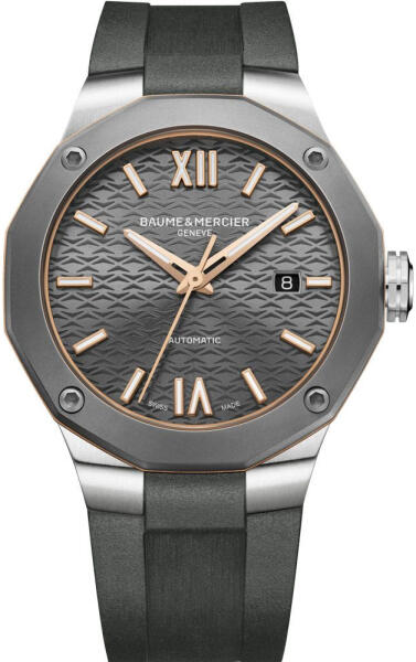 A Baume & Mercier Riviera férfi karóra M0A10660 karóra házának anyaga Nemesacél, színe Ezüst, Szürke, a szíjának anyaga Szilikon és a színe Szürke. Az óratok átmérője 42 mm, alakja Kerek. A karóra üvege Zafír (karcolásmentes), szerkezete Automata és vízállósága 10 atm (100m) (úszásra is alkalmas).
