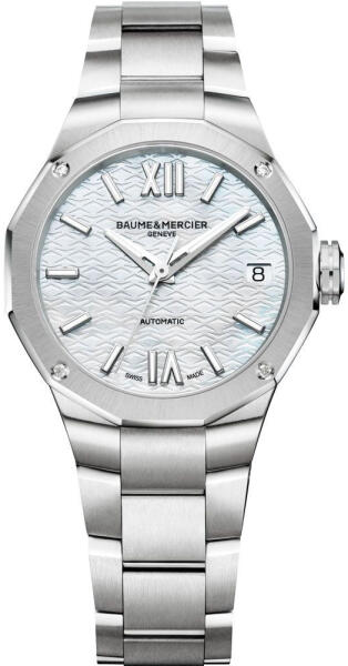 A Baume & Mercier Riviera női karóra M0A10676 karóra házának anyaga Nemesacél, színe Ezüst, a szíjának anyaga Nemesacél és a színe Ezüst. Az óratok átmérője 33 mm, alakja Kerek. A karóra üvege Zafír (karcolásmentes), szerkezete Automata és vízállósága 5 atm (50m) (erősen cseppálló).