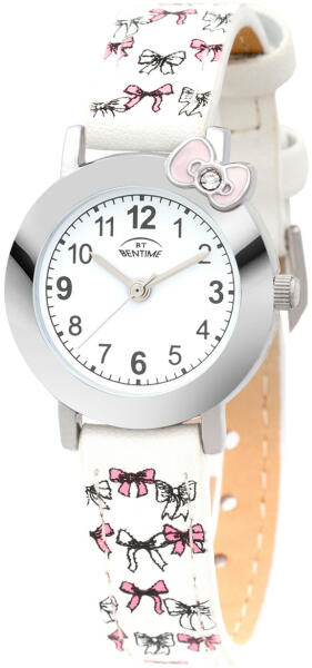 A Bentime márkájú gyermek óra örömet okoz minden kislánynak aki szereti az eredeti kiegészítőket. Első pillantásra felkelti a figyelmet a fém cirkónnal ellátott rózsaszín masni. A tiszta fehér számlap jól olvasható. A bőrszíj része a fehér és rózsaszín masni.