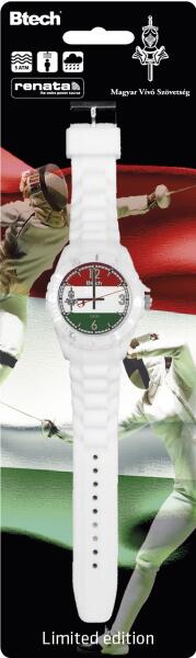 Limitált kiadású, a Magyar Vívó Szövetség jelképével ellátott, analóg szilikon óra fehér színben, fém hátlappal.