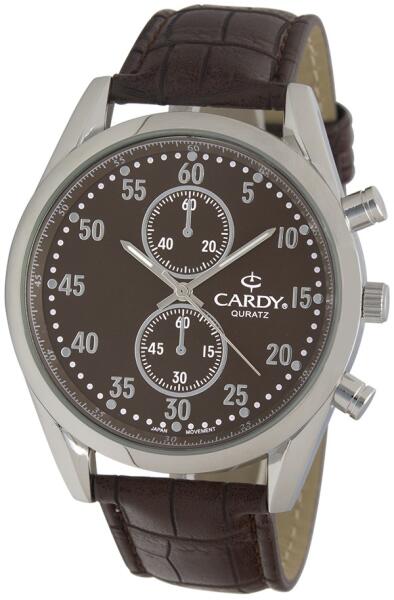 Cardy férfi karóra, ezüst színű fémtok, barna színű szíj, barna színű számlap, quartz szerkezet, cseppmentes vízállóság (2655-1)
