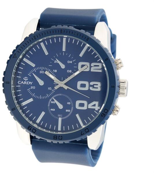 Cardy férfi karóra, ezüst színű fémtok, kék színű műanyag szíj, kék színű számlap, quartz szerkezet, cseppmentes vízállóság (2655-8)