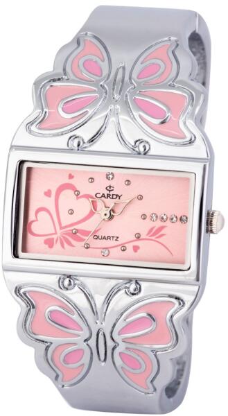 Cardy női ékszeróra, ezüst színű fémtok, pillangós díszítésű ezüst / rózsaszín színű fémcsat, rózsaszínű számlap, quartz szerkezet, cseppmentes vízállóság (2639-6)