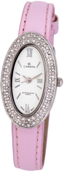 Cardy női karóra, ezüst színű fémtok kő díszítéssel, rózsaszínű szíj, fehér színű számlap, quartz szerkezet, cseppmentes vízállóság (2608-9)