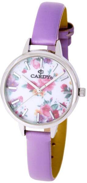 Cardy női karóra, ezüst színű fémtok, lila színű szíj, virágos mintás számlap, quartz szerkezet, cseppmentes vízállóság (2658-1)