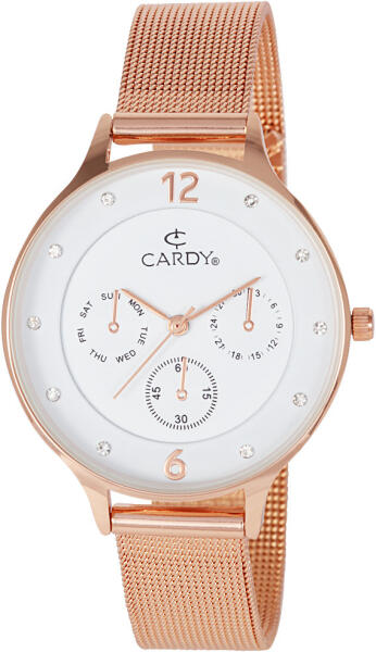 Cardy női karóra, rózsaarany színű fémtok, rózsaarany színű acél karcsat (mesh band), fehér színű számlap, quartz szerkezet, cseppmentes vízállóság (2661-4)