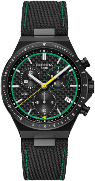 Certina C043.417. 38.201. 10 Férfi Karóra – DS-7 Chronograph Padel Edition by Marta Ortega A Certina DS-7 Chronograph Padel Edition különleges kiadás a híres padel játékos, Marta Ortega inspirációjára készült. A modell a sportos elegancia és a precíziós teljesítmény tökéletes harmóniáját testesíti meg. A 41 mm-es fekete PVD bevonatú rozsdamentes acél tok erőt és modern stílust sugároz, miközben a karbon mintás számlap és a zöld részletek a padel pályák energiáját idézik. A Precidrive kvarc kronográf szerkezet kiemelkedő pontosságot biztosít, akár 1/10 másodperces valós idejű méréssel és 30 perces stopperfunkcióval. A karcálló, tükröződésmentes zafírkristály maximális védelemmel és tisztasággal ruházza fel az órát, míg a Super-LumiNova® bevonat garantálja a kiváló leolvashatóságot gyenge fényviszonyok között is. A fekete textilszíj zöld díszítésekkel sportos megjelenést és kényelmes viseletet biztosít, míg a 100 méteres vízállóság alkalmassá teszi az órát mindennapi és sportos használatra is. Ez az egyedi modell a Certina DS kollekció új, lendületes oldalát mutatja be. Főbb jellemzők: