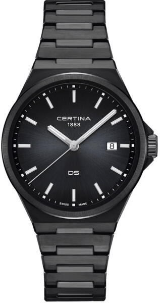 A Certina DS-7 Quartz férfi karóra C043.410. 33.051. 00 karóra házának anyaga nemesacél, színe fekete, a szíjának anyaga nemesacél és a színe fekete. Az óratok átmérője 39 mm, alakja kerek. A karóra üvege zafír (karcolásmentes), szerkezete kvarc és vízállósága 10 atm (100m) (úszásra is alkalmas).