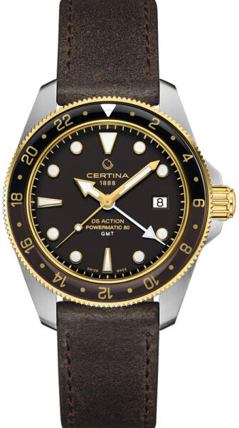 A Certina DS Action GMT Powermatic 80 férfi karóra C032.929. 26.051. 00 karóra házának anyaga nemesacél, színe ezüst, a szíjának anyaga bőr és a színe barna. Az óratok átmérője 41 mm, alakja kerek. A karóra üvege zafír (karcolásmentes), szerkezete automata és vízállósága 20 atm (200m) (búvárkodásra is alkalmas).