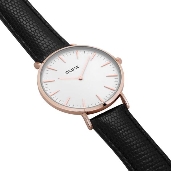 Divat  Cluse  karórák  a La Boheme kollekcióból. Ideális kiegészítők nőknek ,   akik előnyben részesítik az analóg és kerek alakú karórákat. A belül ellenálló 8 mm magas tokban, melyet minőségi sárgaréz  alkot , megbízható elemes (quartz) gépezetet talál, mely 38 mm átmérőjű számlapot működtet. A számlapot ellenálló ásványi üveg  véd. A tok rózsaarany, számlap fehér és a szíj fekete színű. Anyagát tekintve bőr. A karórák v ízállósága  3 ATM .   Használati utasítás csak angol nyelven van Akár 80% kedvezmény több száz termékre!  Itt van a Fekete Péntek!