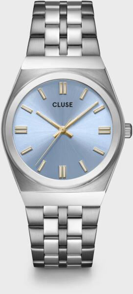 Cluse Retro 70's női karóra CW35102. Öleld át a 70-es évek szellemét a vintage ihletésű Retro 70-es női órával. Merész, kerek, világoskék számlappal, arany mutatókkal, elegáns, 33 mm-es ezüst színű tokkal és rozsdamentes acél, 5 lengőkaros, 20 mm-es szíjjal, amely egy csipetnyi klasszikus hangulatot ad minden megjelenéshez. A szíj méretét könnyedén beállíthatja saját maga.