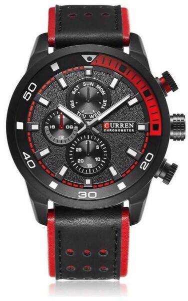 Elegáns Curren férfi karóra. Fekete tok, fekete színű számlap, fekete színű valódi bőrszíj, piros díszítéssel. Sportos és elegáns öltözethez. TULAJDONSÁGOKrozsdamentes acél tok ásványi kristályüveg quartz szerkezet a chronograph csak díszMÉRETEKház szélessége: 4,8 cm ház magassága: 1,3 cm szíj hossza: 27 cm szíj szélessége: 2,4 cm
