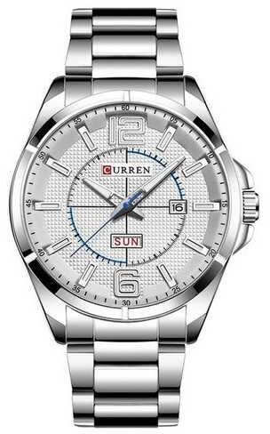 Fehér számlapos férfi karóra, ezüst színű nemesacél szíjjal, dátum és nap kijelzéssel. Sportos és elegáns öltözethez. TULAJDONSÁGOK ásványi kristályüveg quartz szerkezet dátum kijelzés nap kijelzés jól látható számlappalMÉRETEKház szélessége: 4,4 cm ház magassága: 1,2 cm szíj hossza:  állítható hossz szíj szélessége: 2 cm