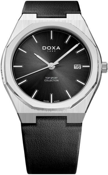 A Doxa Top Sport Collection férfi karóra 169.10. 101.01 karóra házának anyaga nemesacél, színe ezüst, a szíjának anyaga bőr és a színe fekete. Az óratok átmérője 40 mm, alakja kerek. A karóra üvege zafír (karcolásmentes), szerkezete kvarc és vízállósága 5 atm (50m) (erősen cseppálló).