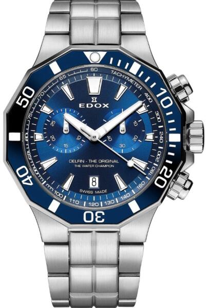 Az Edox Delfin Chronograph 10112 3BUM BUIN egy rendkívül stílusos, svájci gyártmányú kvarc kronográf. A burkolat alatt az Edox Cal. 101 mozgás található, amely a Ronda 5021. D alapú. Ez egy nagyon megbízható, jó svájci mozgás. Maga az óra nagyon elegáns, kényelmes, és szinte minden kívánságot kielégít: AR bevonatú zafír üveggel, lenyűgöző kék számlappal, 200 méteres vízállósággal és kiváló fényerővel rendelkezik.
