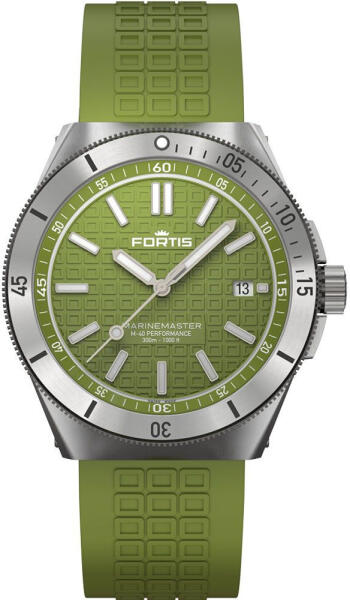 A Fortis Marinemaster M-40 férfi karóra F8120007 648 karóra házának anyaga Nemesacél, színe Ezüst, a szíjának anyaga Szilikon és a színe Zöld. Az óratok átmérője 40 mm, alakja Kerek. A karóra üvege Zafír (karcolásmentes), szerkezete Automata és vízállósága 30 atm (300m) (búvárkodásra is alkalmas).