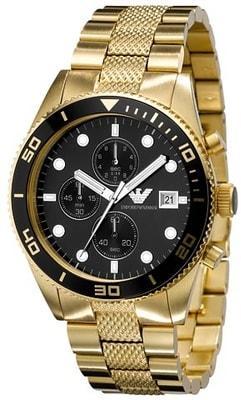 Divat  Arman i (Emporio Armani)  karórák  a Sport kollekcióból. Ideális kiegészítők férfiaknak ,   akik előnyben részesítik az analóg és kerek alakú karórákat. A belül ellenálló 8 mm magas tokban, melyet minőségi acél  alkot , megbízható elemes (quartz) gépezetet talál, mely 43 mm átmérőjű számlapot működtet. A számlapot ellenálló ásványi üveg  véd. A tok arany, számlap fekete és a szíj arany színű. Anyagát tekintve acél. A karórák v ízállósága  5 ATM .   Használati utasítás csak angol nyelven van Akár 80% kedvezmény több száz termékre!  Itt van a Fekete Péntek!