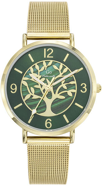 A GO órák világa friss, színes és harmonikus - a francia divatmárka modelljei letisztult eleganciát képviselnek. A tok sárga arany színű IPG bevonattal ellátott fémötvözet, átmérője 36 mm. Számlapja sötétzöld alapon életfa motívum. A nemesacél fémszíj szélessége 16 mm, mely biztonsági zárral kapcsolódik. Az óra sárga színe nagy kopásállóságú IPRG bevonat. Az üvege keményített ásványi üveg, mely ellenáll az enyhe súrlódásoknak, azok nem hagynak rajta nyomot. Japán Miyota 2035 szerkezet garantálja a megbízható pontosságot. Az óra szigetelése cseppálló, mely a kézmosáskor, esőben esetlegesen ráfröccsenő cseppektől véd, de vízbe nem vihető!