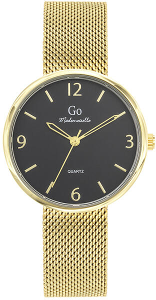 A GO órák világa friss, színes és harmonikus - a francia divatmárka modelljei letisztult eleganciát képviselnek. A tok sárga arany színű IPG bevonattal ellátott fémötvözet, átmérője 34 mm. Számlapja fekete színű. A nemesacél fémszíj szélessége 16 mm, mely biztonsági zárral kapcsolódik. Az üvege keményített ásványi üveg, mely ellenáll az enyhe súrlódásoknak, azok nem hagynak rajta nyomot. Japán Miyota 2035 szerkezet garantálja a megbízható pontosságot. Az óra szigetelése cseppálló, mely a kézmosáskor, esőben esetlegesen ráfröccsenő cseppektől véd, de vízbe nem vihető!