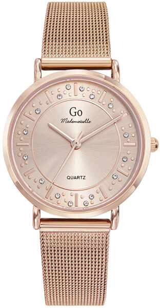 A GO órák világa friss, színes és harmonikus - a francia divatmárka modelljei letisztult eleganciát képviselnek. A tok rozé arany színű IPRG bevonattal ellátott fémötvözet, átmérője 34 mm. Számlapja is rozé színű. A nemesacél fémszíj szélessége 16 mm, mely biztonsági zárral kapcsolódik. Az üvege keményített ásványi üveg, mely ellenáll az enyhe súrlódásoknak, azok nem hagynak rajta nyomot. Japán Miyota 2035 szerkezet garantálja a megbízható pontosságot. Az óra szigetelése cseppálló, mely a kézmosáskor, esőben esetlegesen ráfröccsenő cseppektől véd, de vízbe nem vihető!