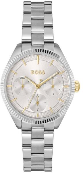 Hugo Boss Sage női karóra típusa 1502800. Hugo Boss karórának a tokja ezüst acélból készült, 34 mm átmérőjű, és fém szíjjal van felszerelve. A tok belsejében egy Miyota szerkezet, az órán pedig egy ásványi kristály található.